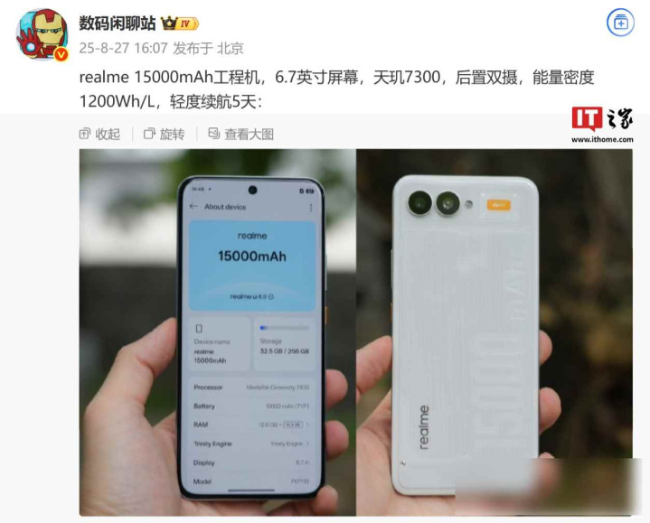 realme在8月27日公布了新款手机,主打15000mAh超大电池。后盖印着电池容量数字,屏幕6.7英寸,配置12GB内存和256GB存储,官方称能连续用五天,拍视频18小时或看视频50小时。这台手机在海外发布,系统显示型号直接叫"realme 15000mAh"。